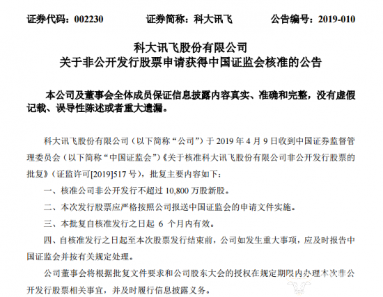 今日,科大讯飞发布公告,称收到中国证监会《关于核准科大讯飞股份有限公司非公开发行股票的批复》,批复核准科大讯飞非公开发行不超过10800万新股,自核准发行之日起6个月有效。