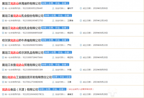 记者从国家企业信用信息公示系统输入“完达山”关键词,名称内含有“完达山”名称的企业众多,其中包括黑龙江完达山林海液奶、黑龙江完达山阳光乳业有限公司、河北完达山贝兰德乳业有限公司、天津完达山乳品有限公司、河北完达山贝兰德乳业有限公司、完达山鞍山乳品有限公司等,这些企业均直接或间接受到完达山乳业控制。