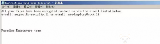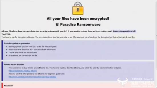 近日,亚信安全截获最新Paradise(天堂)勒索病毒,该病毒加密本机及共享文件夹中的文件。加密后的文件名变为[原文件名]_[随机字符串]_{immortalsupport@cock.li}.p3rf0rm4,亚信安全将其命名为Ransom.Win32.PARADISE.A。