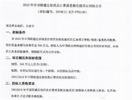 运营商财经网讯 近日消息 据来自中国联通的官方信息显示,中国联通软件研究院日前开启2019年中国联通总部消息计费消息侧实施项目招标公告,最高投标限价为540万元(含税)。