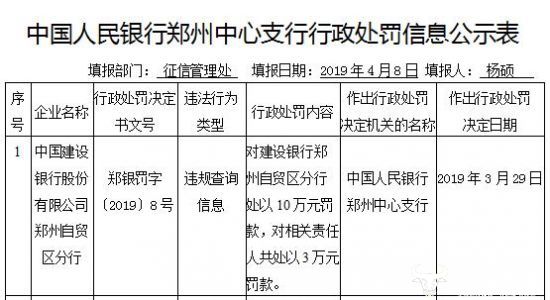 日前,中国人民银行郑州中心支行公布的行政处罚信息公示表(郑银罚字〔2019〕8号)显示,中国建设银行股份有限公司郑州自贸区分行违规查询信息,被中国人民银行郑州中心支行处以10万元罚款,对相关责任人共处以3万元罚款。