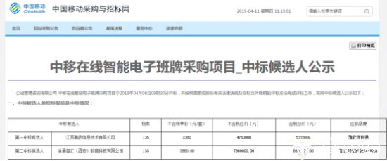 4月11日,中国移动正式公示其中移在线智能电子班牌采购项目的中标结果。第一中标候选人为江苏腾武信息技术有限公司,第二中标候选人为金通智汇(西安)教育科技有限公司。