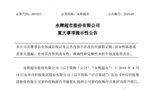 4月12日,永辉超市股份有限公司披露重大事项提示性公告。公告显示,公司于2019年4月11日向中百控股集团股份有限公司发出《中百控股集团股份有限公司要约收购报告书摘要》。