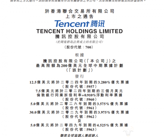 根绝该计划,腾讯控股发行12.5亿美元将于2024年到期的 3.280%优先票据;7.5亿美元将于2024年到期的三个月美元伦敦银行同业拆借利率+ 0.910%浮动利率票据;5.0亿美元将于2026年到期的3.575%优先票据、30.0亿美元将于2029年到期的3.975%优先票据及5.0亿美元将于2049年到期的4.525%优先票据(「票据」)上市。