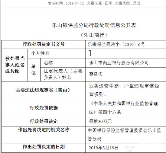 今日,中国银保监会网站披露了乐山监管分局对乐山市商业银行股份有限公司及相关责任人的行政处罚决定书。决定书显示,乐山市商业银行股份有限公司法定代表人蔡昌庆因业务运营中断,严重违反审慎经营规则,乐山监局依据相关规则罚款50万。