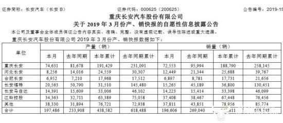 4月11日晚,重庆长安汽车股份有限公司公布了关于2019年3月份产销快报。快报显示,长安汽车3月产量为197486辆汽车,同比减少15.57%;三月销量为196,606辆,相比去年同期269,040辆的销量大幅下滑了26.92%。