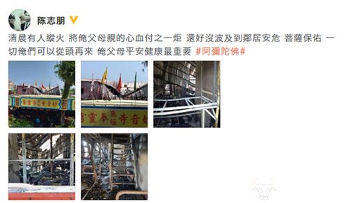4月12日,陈志朋在微博发文表示父母家清晨遭人纵火,所有心血付之一炬,所幸没有波及邻居安危,并表示,一切都可以从头再来,只要父母平安健康最重要。