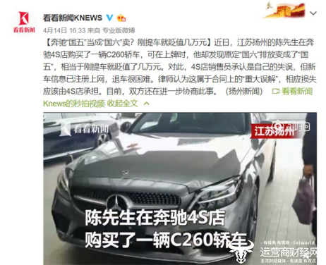 近日,有爆料称,江苏扬州的陈先生在奔驰4S店购买了一辆C260轿车,可在上牌时,原定“国六”排放变成了“国五”,相当于刚提车就贬值了几万元。