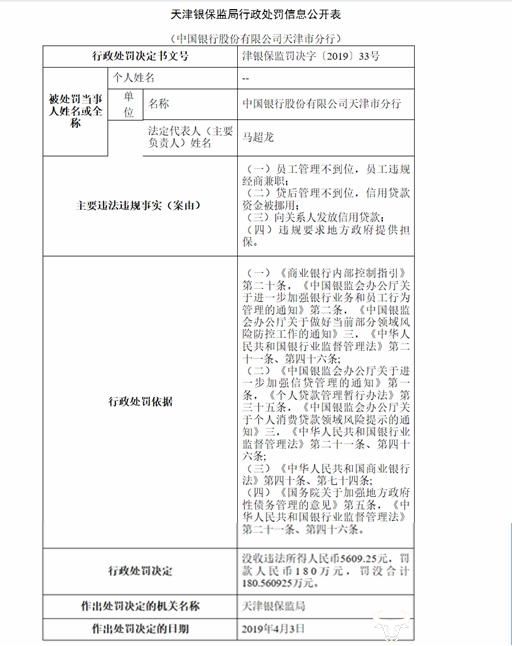 据了解,中国银行天津银行的四项违法行为分别包括员工管理不到位,员工违规经商兼职;贷后管理不到位,信用贷款资金被挪用;违规向关系人发放信用贷款;违规要求地方政府提供担保。