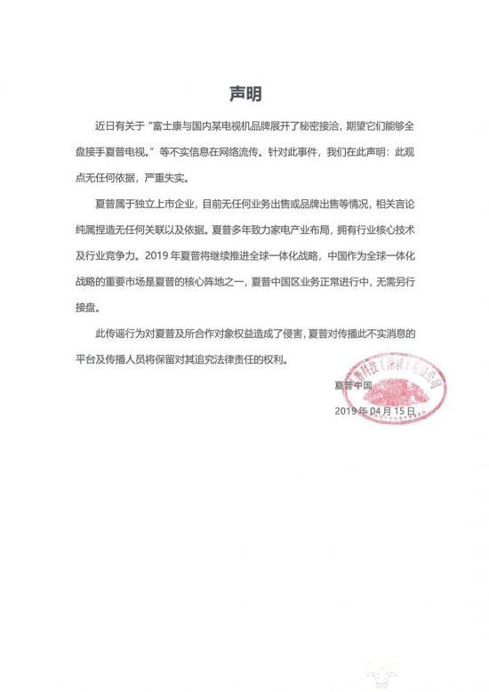 同时,夏普还表示,夏普属于独立上市企业,目前无任何业务出售或品牌出售等情况,相关言论纯属捏造无任何关联以及依据。并且该传谣行为已对夏普及合作对象权益造成了侵害,夏普对传播此不实消息的平台及传播人员将保留对其追究法律责任的权利。
