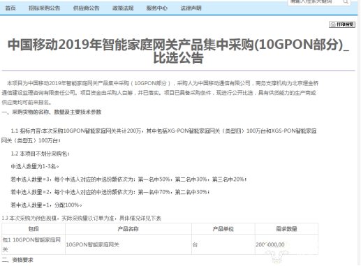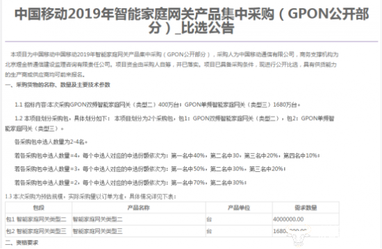 4月15日,中国移动公布2019年智能家庭网关产品集采(10GPON部分)公告。