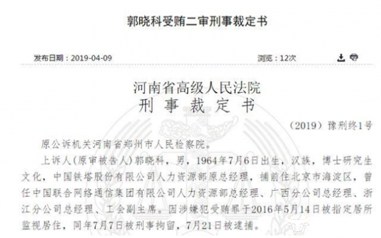 运营商财经网讯 日前,从裁判文书网获悉,中国铁塔原人力资源部总经理郭晓科犯受贿罪,河南省高级人民法院裁定维持原判,判处有期徒刑11年,并处罚金80万元。