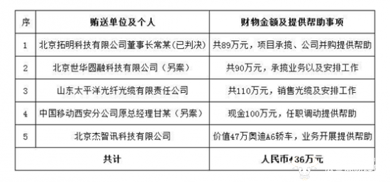 其中,为中国移动西安分公司原总经理甘某(另案处理)的任职调动提供帮助,非法收受甘某给予的现金共计100万元。为北京杰智讯科技有限公司的业务开展提供帮助,非法收受杰智讯公司给予的奥迪A6轿车一辆,价值47.34万元。为山东太平洋(601099)光纤光缆有限责任公司、北京世华圆融科技有限公司的销售及工作安排提供帮助,共收受200万元。