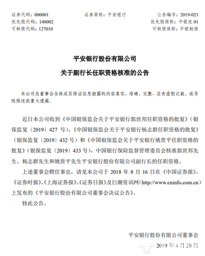 运营商财经网讯 4月19日晚,平安银行发布公告称,近日收到银保监会批复,郭世邦担任该行副行长的任职资格获核准。具体如下: