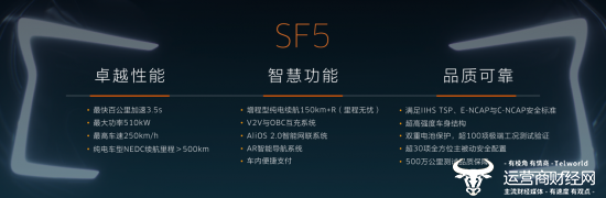 集卓越性能、智慧功能、品质可靠三大优势于一体,新电动轿跑SUV SF5将为用户带来出色的驾乘体验。新车在性能上可实现510kW的最大功率、1040N·m的最大扭矩,百公里加速最快可小于3.5s,最高车速可达250km/h。与此同时,SF5还大大缓解了里程焦虑,其中SF5纯电车型NEDC续航超过500km,增程型配以高效能增程系统,可实现超过150km纯电续航+R的里程无忧,让“没有到不了的远方”不再只是口号。此外,SF5还搭载了30余项主被动安全配置,同时满足IIHS TSP、E-NCAP与C-NCAP安全标准,高达1500MPa热成型高强钢、独特的电池包双重保护设计以及超过100项极端工况测试验证,为用户的安全出行提供了全方位保障。