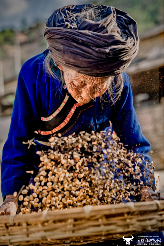 ▲90岁的傈僳族老人交蒙阿凤(傈僳语音译)在屋外扬咖啡,一年四季围绕咖啡劳作已成为当地人的生活的一部分。