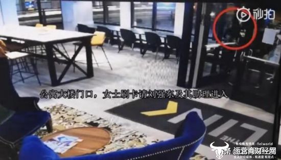 第二段视频显示,刘静尧(音)在公寓大门口刷卡后请刘强东及其助理进入公寓,随后一同进入电梯。在另一电梯门口,刘静尧(音)和刘强东两人进入电梯,助理留在了电梯外。接下来的画面中,两人换乘电梯,且女方挽着刘强东胳膊。视频中文字显示,“女士挽着刘强东走到房间,并主动开门,请其进入”。