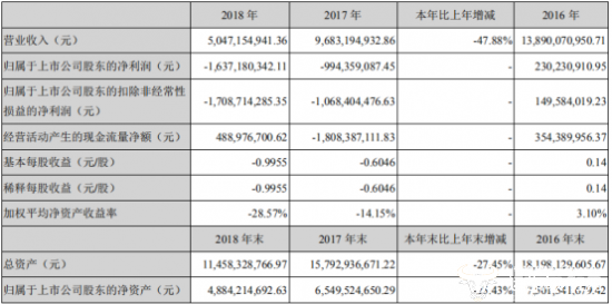 具体而言,2018年营业收入50.47亿元,2017年为96.83亿元,同比大幅跌落47.88%。归属于上市公司股东的净利润持续减少,本期再次减少16.37亿元。这是继2017年减少10.68亿元以来第二次下降。