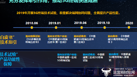 目前,中国联通面向友好用户体验进行第一阶段5G终端试验;今年6月,中国联通将面向试商用网络,发布《中国联通5G终端白皮书 第二阶段》,开启第二阶段5G终端试验;年底,中国联通将面向商用发布《中国联通5G商用终端白皮书》,进行中国联通5G商用终端入库测试。