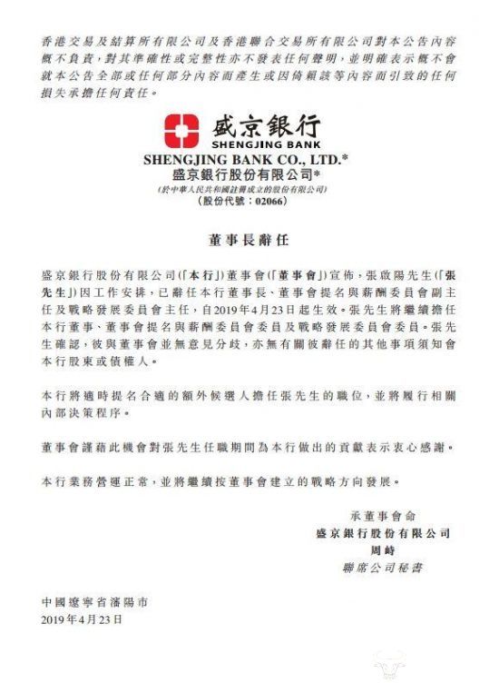 近日,盛京银行对外宣称,张启阳因工作安排,已辞任盛京银行董事长、董事会提名与薪酬委员会副主任及战略发展委员会主任,自2019年4月23日起生效。