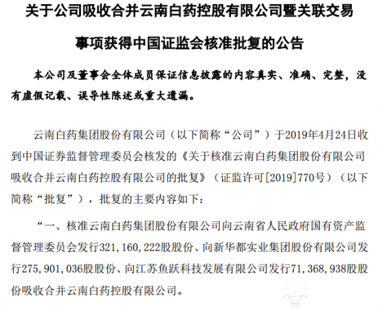 公告称,云南白药于2019年4月24日收到证监会核发的《关于核准云南白药集团股份有限公司吸收合并云南白药控股有限公司的批复》。