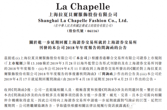 4月24日,拉夏贝尔发布关于进一步延期回复上交所关于2018年度报告问询函公告。