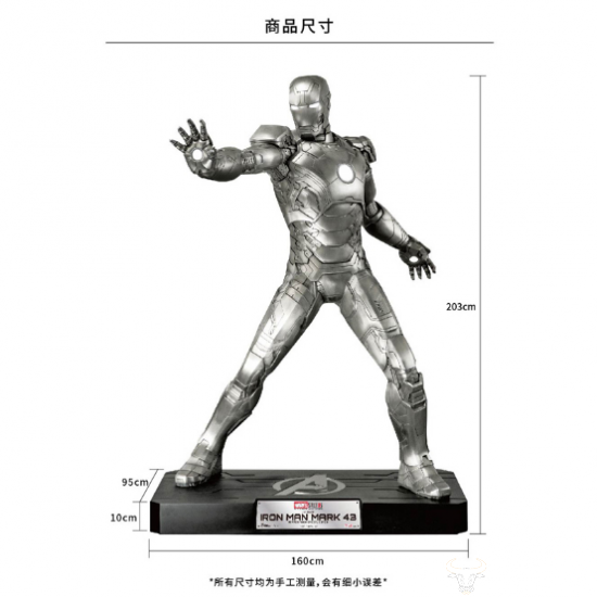 2018年是漫威影业10周年特别纪念,钢铁侠于2008年推出后,为漫威宇宙解开序幕,也让钢铁侠一跃成为影史上非常受欢迎的超级英雄人物,为了欢庆漫威影业正式迈入10周年,野兽王国与拥有百年历史的锡镴精品品牌【皇家雪蓝莪】,携手打造献给漫威超级英雄迷的一份大礼——1:1钢铁侠马克43锡镴特制联名典藏款(高约203公分)。此款藏品为全手工打造,在复现钢铁侠金属质感基础上更加入手工独有价值。因为锡腊合金材质的特殊性,每台都是皇家雪兰莪精工名匠耗时数周时间纯手工打造,全球限量30座,独一无二的限量收藏编号立牌,起拍价¥146,520