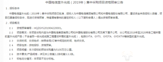 日前,据中国电信官网消息,中国电信已开始2019年光缆(室外光缆与引入光缆)集中采购项目资格预审工作,这也意味着正式集采工作将于近期开始。