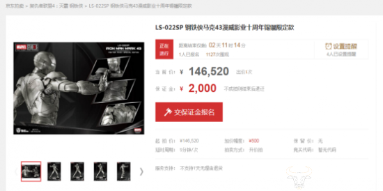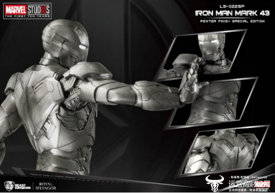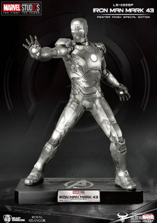 第一件藏品是在漫威十周年之际,野兽王国与拥有百年历史的锡镴精品品牌【皇家雪蓝莪】,携手打造献给漫威超级英雄迷的一份大礼——1:1钢铁侠马克43锡镴特制联名典藏款(高约203公分)。此款藏品为全手工打造,在复现钢铁侠金属质感基础上更加入手工独有价值。因为锡腊合金材质的特殊性,每台都是皇家雪兰莪精工名匠耗时数周时间纯手工打造,全球限量30座,独一无二的限量收藏编号立牌,起拍价¥146,520