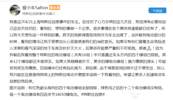 今日,特斯拉自燃事件车主在网络发布消息称,在残骸调查现场看到拆解到电池部分的时候发现,电池模组(共有16组)中靠近车头方向的四个模组已烧毁,其余12个模组都还未被波及。