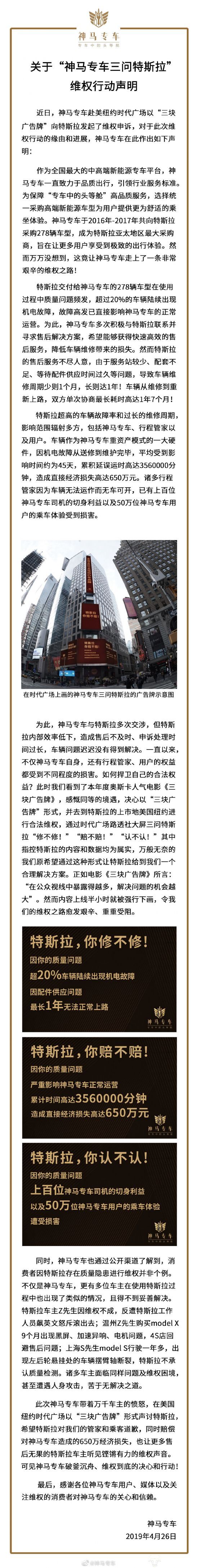 近日,神马专车赴纽约时代广场以“三块广告牌”向特斯拉发起了维权申诉。而对于此次维权行动的缘由和进展,神马专车称,在2016年-2017年共向特斯拉采购278辆车型,而这278辆车型在使用过程中质量问题频发,且超过20%的车辆陆续出现机电故障,故障高发已直接影响其正常运营。