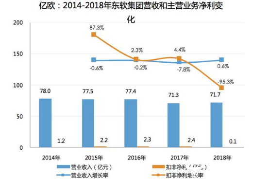 4月27日,东软集团发布2018年年度报告。报告期内,公司实现营业收入71.71亿元,同比增长0.55%,归属于上市公司股东的净利润1.1亿元,同比下降89.60%,扣除非经常性损益后的净利润1118万元,同比下降95.27%。