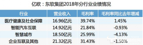 东软集团成立于1991年,是中国第一家上市的软件企业,除了在医疗健康及社会保障方面有较大布局,也涉猎了智能汽车互联、智慧城市、企业互联等领域。从不同行业数据看,东软集团的四大业务仅有医疗健康及社会保障的利润率稍有上升,同比增长1.45%,其余业务均同比下降。
