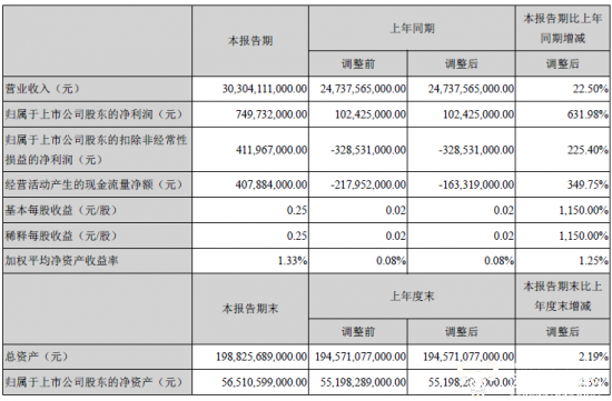 报告显示,本报告期营业收入303.04亿元,上年度营业收入247.38亿元,本报告期比上年度末增加22.50% 。本报告期其归属于上市公司股东的净利润为7.5亿元,上年度为1.02亿元,本报告期比上年度增加631.98% 。