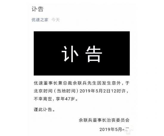 据了解,余联兵于北京时间2019年5月2日12时许离世,享年47岁。在此意外事件发生后,优速快递表示,公司主要管理层已在第一时间快速响应并妥善处置。在主要股东和全体董事会成员的支持下,公司运营秩序正常,网络状态稳定,各项工作和任务推进未受任何影响。