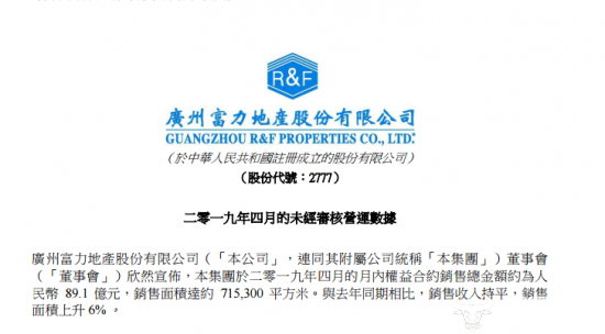 5月6日,广州富力地产股份有限公司披露了2019年4月未经审核营运数据。数据显示,公司于2019年4月的月内权益合约销售总金额约为人民币 89.1 亿元,销售面积达约 715,300 平方米。与去年同期相比,销售收入持平,销售面积上升 6% 。
