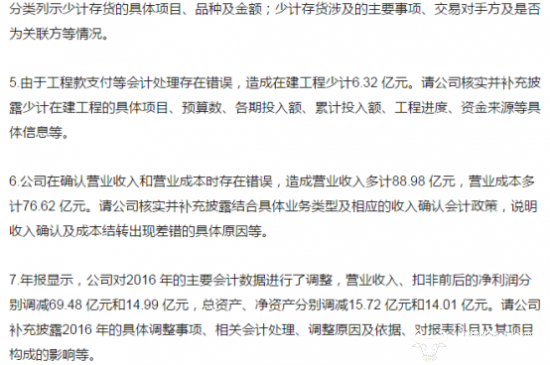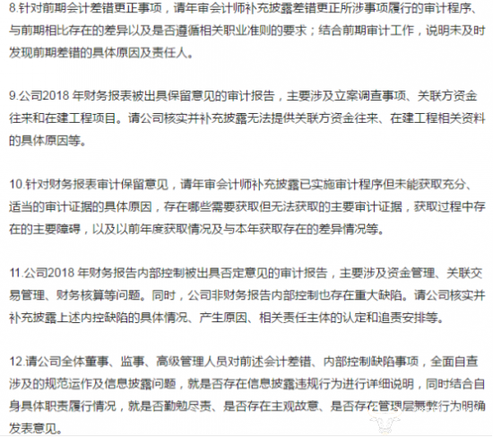 上交所下达的问询函包含12个问题,刨根究底式询问,要求公司核实并补充披露多计货币资金的存放方式、主要账户、限制性情况、是否存在违规资金使用及资金的主要去向等。具体问题如下: