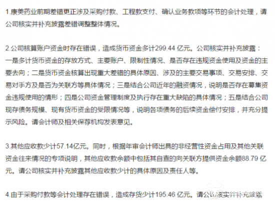 此前,康美药业发布公告,称公司核算资金时存在错误,造成货币资金多计299.44亿元,近300亿元突然消失,引发舆论高度关注。在收到上交所监管函之后,如今又收到了更为详细的问询函。