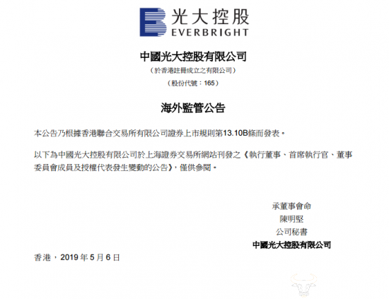 5月6日晚,中国光大控股(港股00165)发布了公司执行董事、首席执行官、董事委员会成员及授权代表发生变动的公告。公告显示,陈爽因工作安排原因已于5月3日辞去执行董事及首席执行官等职务,且不再担任董事会下属执行委员会及战略委员会成员。