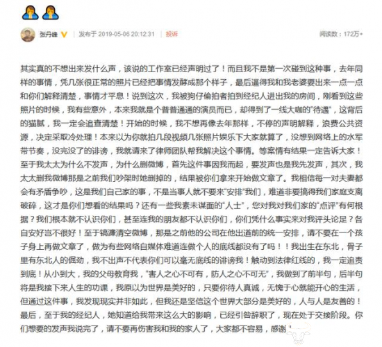 张丹峰发博文称本来以为曝光者就拍几段视频几张照片娱乐下大家就算了,没想到网络上的水军带节奏,没完没了地诽谤,于是请来了律师团队来帮忙解决等案情有结果会告知大家,而毕滢已经引咎辞职。