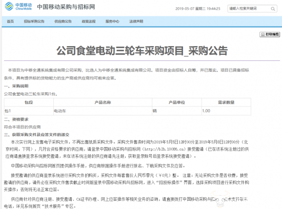 近日,中国移动政企公司发布了一条有意思的采购公告,中移全通计划为公司食堂采购电动三轮车,采购数量仅为1台,令人哭笑不得。