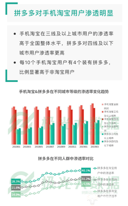 报告认为,这是“电商巨头推动整体行业增长”的结果。数据显示,截至2019年第一季度,新电商平台拼多多的新增用户中有44.2%来自二线及以上城市,呈持续上升趋势。而拼多多对淘宝用户的渗透率也在提升,从去年同期的28.3%上升到了40.1%。