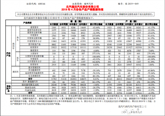 5月9日,福田汽车发布其2019年四月产销数据。据快报显示,公司1-4月份累计产量19.66万辆,同比增长14.52%。