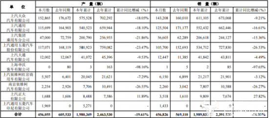 此外,据报告数据显示,上汽集团在2019年1-4月累计产量为198万辆,同比下降19.61%;累计销量同比下降16.8%,约为199万辆。
