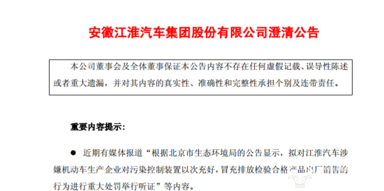 而目前江淮汽车正联合相关发动机供应商进行深入的技术研究,分析可能产生问题 的原因,同时也在积极配合北京市生态环境局做好听证环节的相关准备工作。