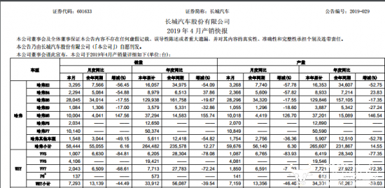 报告期内,长城汽车实现销量8.38万辆,同比增长2.5%;而2019年前四个月累计销量为36.77万辆,同比增8.65%。