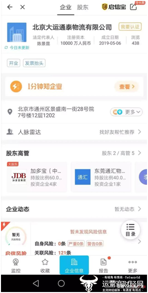 据企信宝数据显示,北京大运通泰物流有限公司成立于5月6日,法定代表人陈景昆,注册资本1亿元,加多宝(中国)饮料有限公司成为最大股东,持股比例60%,认缴出资额6000万。第二大股东为东莞通汇物流有限公司,持股比例40%。