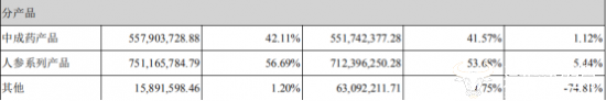 从具体产品经营情况上看,人参系列产品占比最高,为56.69%,营业收入为7.51亿元;其次为中成药产品,2018你那营收为5.58亿元,占比42.11%;其于业务占比仅1.2%。