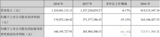 营收无明显波动,但值得注意的是,2018年该公司归属于上市公司股东的净利润仅为1.74亿元,不及2017年净利润的一半,同比下降了53.15%;扣非净利润为1.6亿,同比下降了56.23%。
