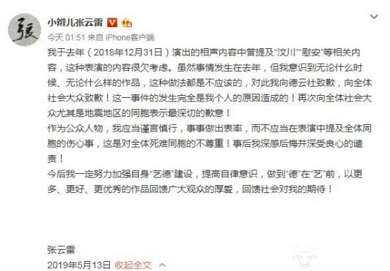 所谓人红是非多,德云社张云雷近日又摊上事了。5月12日,是汶川地震11周年,然而网上却流传出张云雷早前曾在相声演出中拿汶川地震开玩笑的视频。